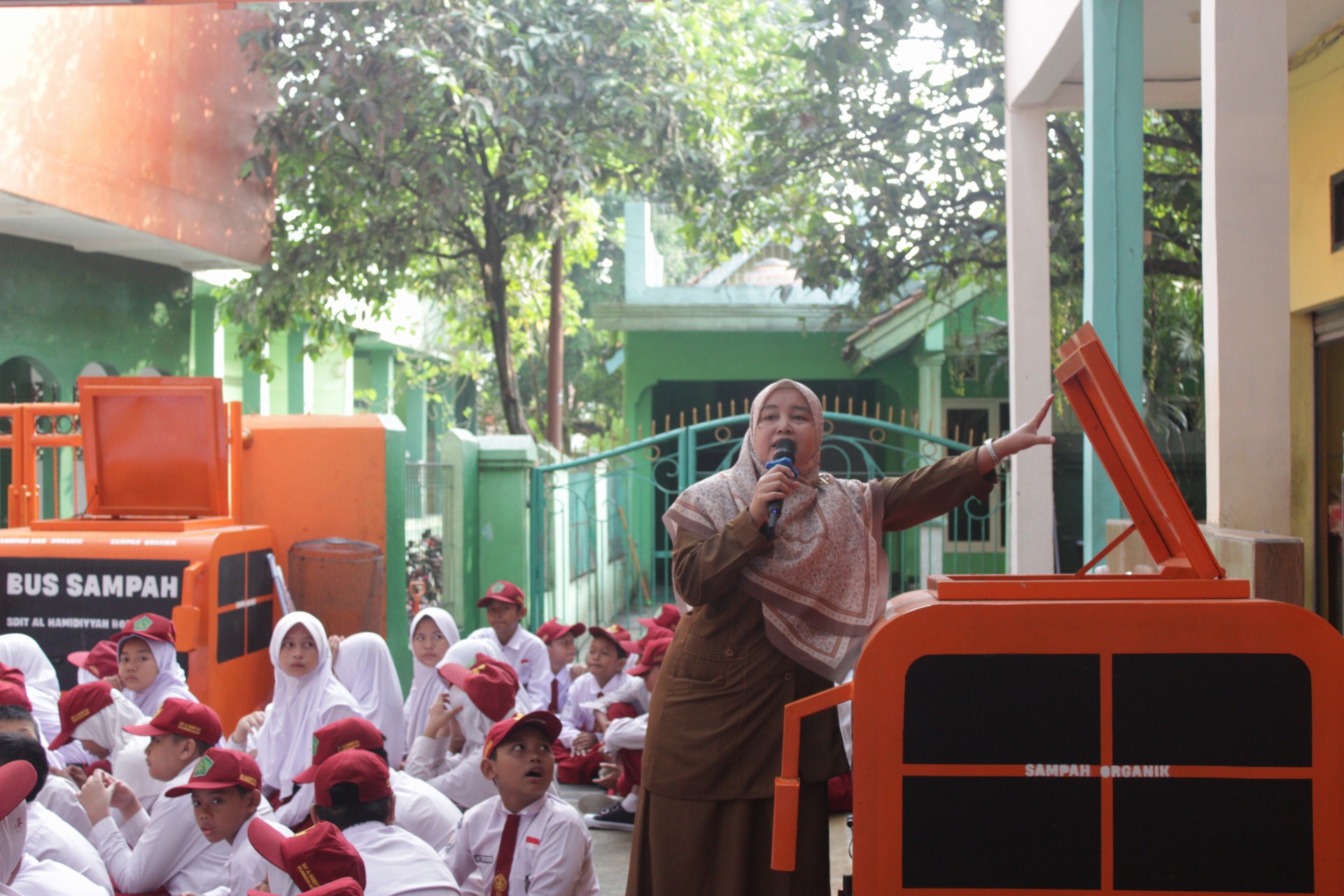 Wakasek Kurikulum dan Kesiswaan memberikan edukasi siswa/i tentang sampah pilah dengan adanya bus sampah di SDIT Al-Hamidiyyah Bojonggede.